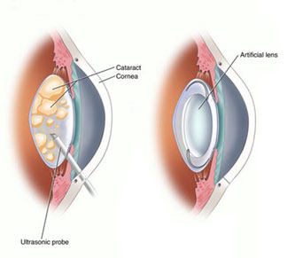 Phacoemulsification is a surgical method in which an ultrasonic oscillating probe is inserted into the eye. The probe breaks up the center of the lens. The fragments are suctioned from the eye at the same time.